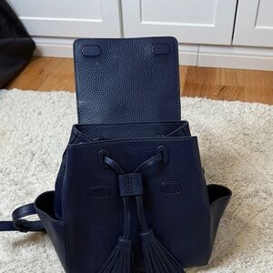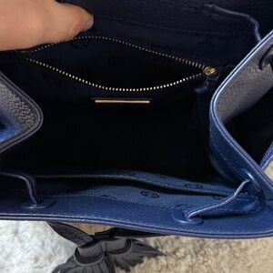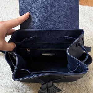 Amazing condition! This stylish navy blue leather backpack is perfect for any occasion. Its sleek design and high-quality material make it a must-have accessory.