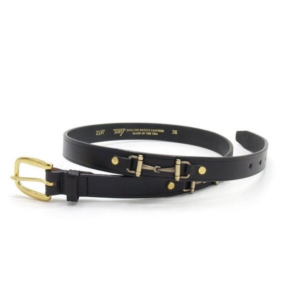 This Tory Leather belt is handcrafted in the USA from English bridle leather and finished with iconic brass snaffle bits and a matching buckle. The equestrian-inspired details and polished finish make it a versatile piece for styling with breeches, denim, or dresses. The brass has worn to a soft silver tone, adding character without affecting durability.