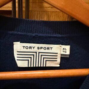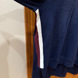 Tory Sport Navy Pullover Crewneck Sweater in Navy, XL with Ivory/Burgundy Side Stripes above the slide slits.