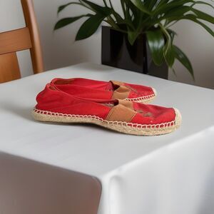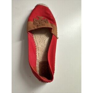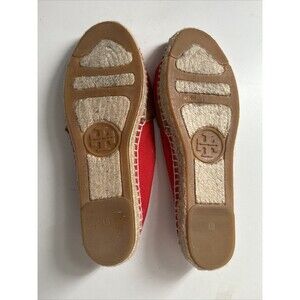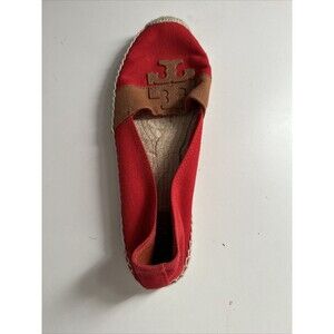 These are Tory Burch Women's Espadrille Flats in red, featuring a closed toe design with a slip-on closure. The shoes are size 8M (US) / 9.5M (UK/AU), crafted from leather with a textile linen outsole. The flats are adorned with the Tory Burch logo and offer comfort, making them ideal for casual occasions.