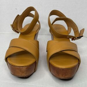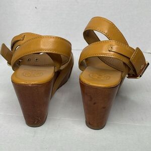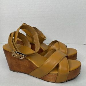 Tory Burch wedge platform sandals with tan leather straps across vamp and ankle strap with buckle closure. Leather footbed and lining with wood platform and wedge heel. Good condition.