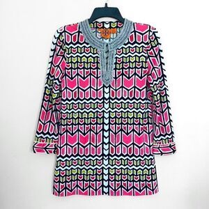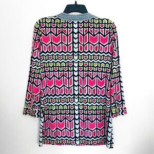 Colorful 60’s inspired geometric print, beaded neckline with hook clasps, long sleeved with button cuffs, 100% silk. In good pre-owned condition. Found two very small imperfections, shown in last two pics.