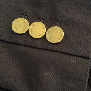 Good tone hardware and buttons. Completely scratch free. Very light stain on one of the sleeves, as shown in photos- no other noticeable flaws