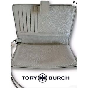 Stylish Tory Burch wristlet wallet in gray. Features a sleek design with a removable wrist strap.
