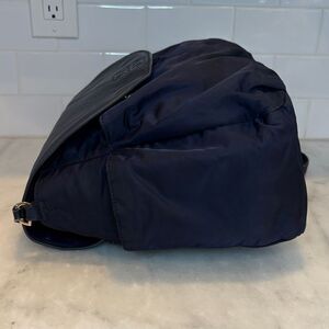 Authentic designer Tory Burch Nylon & Leather Weekender or Diaper Baby Messenger Bag is preowned. Navy blue nylon and navy blue leather with Tory Burch iconic logo on the front of the bag makes it a chic bag for carrying everything you need for you baby or a weekend away! Tory Burch Thea Nylon Messenger Baby Bag Tote in navy blue, featuring a flap closure with a prominent double-T logo medallion on the front. The bag is constructed from durable nylon with pebbled leather trim, particularly on the flap and strap accents, combining functionality with a touch of luxury. It's a messenger-style bag with an adjustable crossbody strap, allowing for versatile carrying options. The navy blue color is complemented by gold-tone hardware. It includes multiple exterior pockets for easy access, such as slip pockets under the front flap, a back slip pocket, and side slip pockets. The interior is lined with a logo-jacquard fabric and offers various pockets for organization, including a zip pocket, wall pockets, and smartphone pockets. This bag is designed as a baby bag and includes a removable, coordinating changing pad for on-the-go diaper changes. It also features stroller straps for convenient attachment to a stroller.