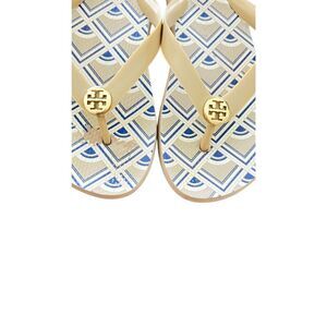 Tory Burch Elevate your shoe game Mini Minnie Flat Flip Flop - Firefly - Blue/tan size 8 Designed with a soft rubber thong-strap that features the label's logo emblem, and a stack of monochrome stripes to create a cushioned footbed.