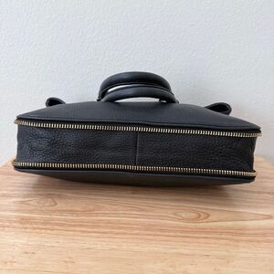 Pebbled black leather, gold hardware. Zip around expansion, fold over magnetic clasp, interior zip pocket and two smaller open interior pockets.