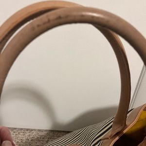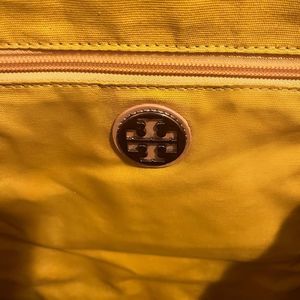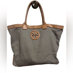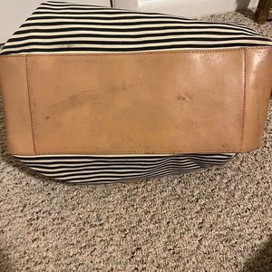 Tory Burch Navy and Ivory striped tote - good condition! See pics for marks on strap and bottom of bag. Inside good condition a little wrinkled. One very small stain inside pocket of bag. See pictures. 22”L x 7”W x 14.5” H. I love this bag it holds SO much stuff and it’s perfect for a day at the pool or beach especially if you have kids!