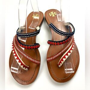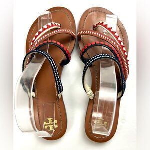 Gently worn Tory Burch Patos embroidered leather sandals. Step out in style with these chic multicolor sandals. Perfect for any casual outing, these sandals offer both comfort and flair.