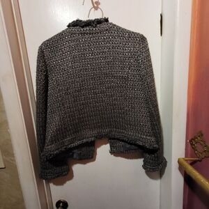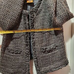 Elevate your wardrobe with this stunning Tory Burch jacket! The grey blue tweed pattern and ruffle trim details give off a designer and preppy vibe. This collarless jacket features two front slit pockets and a hook & eye closure. It is made of wool and linen fabrics, making it perfect for winter, fall, and spring seasons.