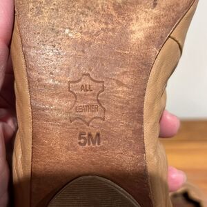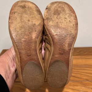 Adorable ballet flats with a logo in the center of the leather flower. Leather overall is great with a minor scratch on one toe as seen in last picture. Very cute and a sand color that goes with anything pair of pants or jeans, or a sundress!
