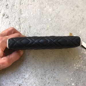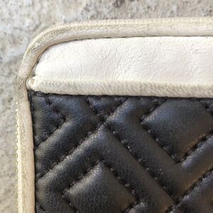 White wristlet, please look at the pictures all of the edges show wear. I tried touching up to see if it will absorb and it does. Needs to be finished by someone else. Inside is super clean. Measure six by almost 4” with six compartments for credit cards