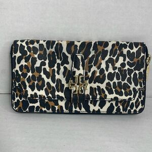 Tory Burch leopard print zip-around wallet in saffiano leather. Gold tone logo on front pocket strap. Signat black interior lining with middle zipper coin pocket and 8 card slots. Excellent condition