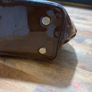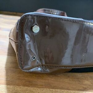 Tory Burch tote in black cloth and brown patent leather with two inside open pox and one inside zip pocket. Missing a footing on the bottom (see pic). 14x15x3 Comes with original dust bag.