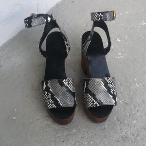 These are nice wood platforms but please look at the pictures as the wood has discolored some and darkened throughout. Heel height is 4 inches platform height is 1.5 inches.