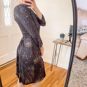 Features 3/4 length sleeves, boat neck, self-tie belt, pleated skirt, soft rayon Jersey fabric, material is stretchy, unlined, knee length, brown/blue animal print