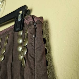 This is a chocolate brown skirt by Tory Burch. It has brass tone embellishments on the waist. Note one is missing as shown in the photos. There is a zipper on the side with a clasp, and a solid lining underneath.