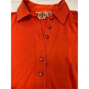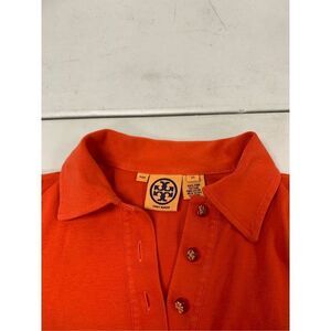 Ladies super cute orange cotton knit rugby style polo top by Tory Burch. Top is missing a button. Very easy fix. Otherwise in great condition. Ladies size XS. Material has stretch.