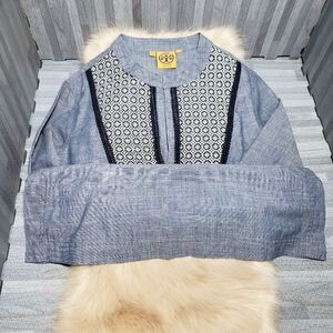 Tory Burch Womens Bernadette Tunic Top Cotton 3/4 Sleeves Faded Blue, size 6, great condition, see pictures for more details.