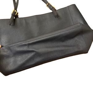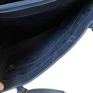 Navy blue leather tote. Gold hardware. Multi compartments. Inside divider pocket with zip. One side has two slip pockets and one zip pocket. The other side two slip pockets. One handle has a 4.25” piece of edging that’s come off. There’s a few marks on the bag, as shown. Overall very good condition.