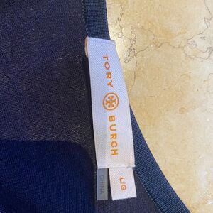 Tory Burch short sleeve sweater with ruffle detail in front, size large in Navy