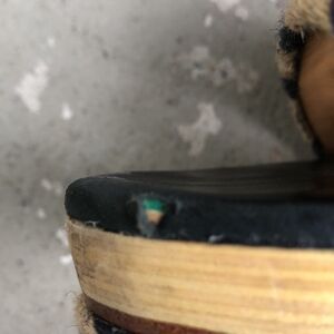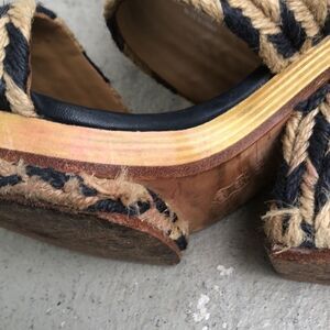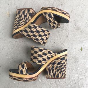 Super cute with a platform. Rachel needs to have a piece glued down by the shoe man so please check out the pictures. Rug finished it is natural and navy in color heel height is 3.5 inches platform is 1”
