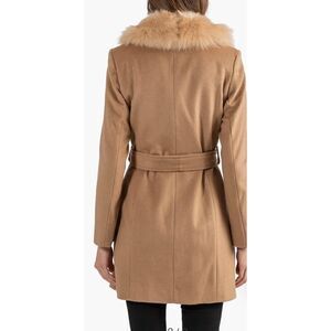 Shaggy genuine shearling trims the shawl collar of this soft, wool blend coat with a flattering belted waist.