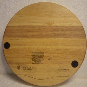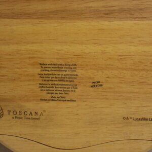 This circular wooden board is made of eco-friendly rubberwood or acacia wood and features a laser engraved design of the Death Star on to. The board swivels open to reveal a set of four stainless steel cheese tools with matching handles. The tools include a cheese cleaver, a cheese planer. a fork-tipped cheese knife and a hard cheese spreader/knife. This item is preowned and is in good condition. Little or no wear can be seen.