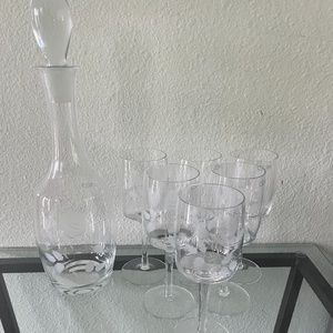 New with label wine set. Handmade in Romania. Includes decanter, stopper and 6 wine glasses. All etched with same floral pattern.
