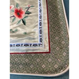 Size: Approximately 15.5" square. All different center embroidery designs but ALL have blue/peach/green satin and brocade birds and butterflies and plants and flowers.