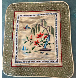 Gorgeous Asian themed toss pillow cover. A silk & rayon blend satin finish fabric cover with hand embroidery design on the front - design includes themes like plants, butterflies and flowers. Zipper on one side for easy on & off. Tagged Sun's Made in China.