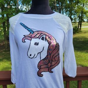 Total Girl Pullover Long Sleeve sequin unicorn sweater, lace on shoulder area. Soft and warm, perfect for fall to winter!