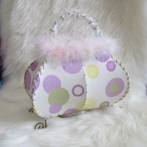 Faux pink feathers, canvas body with cute stitching, and swirly legs