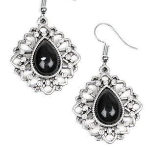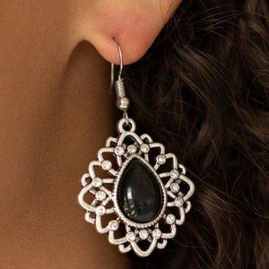 A glowing black cat's eye teardrop is pressed into the center of a frilly silver frame radiating with glassy white rhinestones for a refined look.