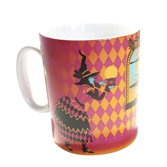 Totally Ghoul Halloween Witch Ceramic Mug Pink/Orange Harlequin Cat & Bat Design