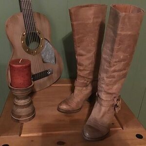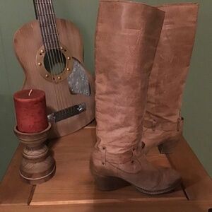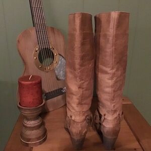 I,m a 70’s buff and I searched for years for the perfect boot for me. Here it is, the Sixty Seven brand. These are made in Spain so Size 38 is US 7 1/5. The harness is a bow knot rather than hardware, and the heel is 3” slanted. I love the golden beige distressed color, to me these are the epitome of the 70’s, obvious by the toe of the boot. These are my all time favorite boots EVER, and I have a LOT of boots. I looked for years for another pair and finally found some, but these will be extinct pretty soon. If you’re a 70’s buff then these are the boots for you. Perfect for a long skirt and denim jacket. Lots you can do with these. Note: the shaft is 17” and shaft opening is 14”