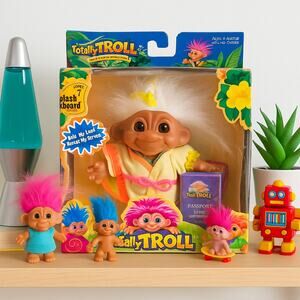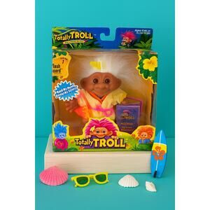 Step back into early-2000s nostalgia with this Totally Troll Splash Waxboard Series 1 doll by Playmates (2001). This collectible troll features classic white troll hair, a bright tropical outfit, and includes a “passport” accessory.