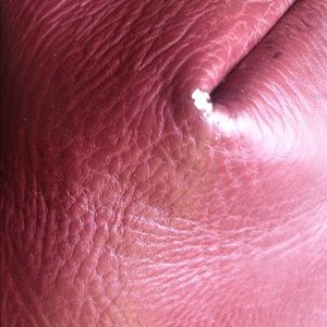 This is a two tone faux leather tote bag and a detachable wallet with a zipper closure. The tote has a double handle and a top magnetic closure. For versatility this bag can be reversed. There are a few minor flaws on the dark red side, see pictures. This tote is in very good condition.