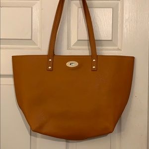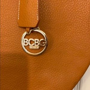 Tan leather colored BCBG golf accents clean inside and out lightly used great bag for carrying a lot of items