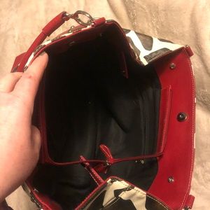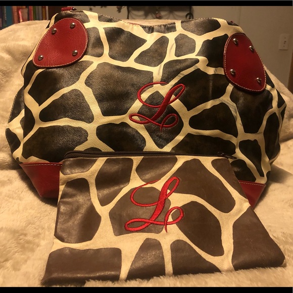 Giraffe print tote with matching pouch both monogrammed with the letter L, small discoloration on front shown in pic