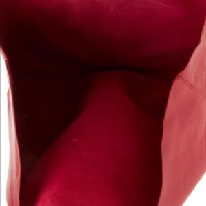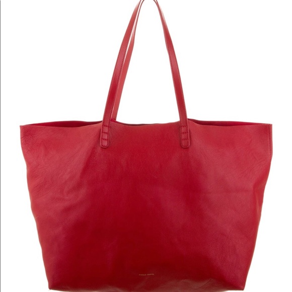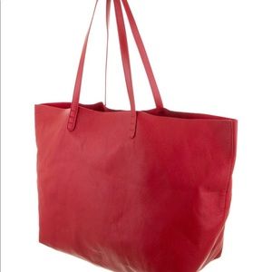 Pristine red lambskin Mansur Gavriel Oversized tote bag with gold-tone hardware, dual flat shoulder straps, foil-stamped logo at front, tonal hide interior and open top. Includes accompanying zip pouch. Never been used.