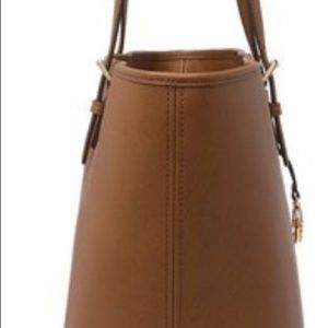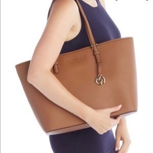 An elegant structured tote is outfitted with a variety of interior pockets to keep you organized. - Dual top handles - Open top - Exterior features saffiano textured leather construction with detachable logo bag charm - Interior features center divider zip pocket, 8 slip pockets, wall zip pocket - Approx. 11.5" H x 18.5" W x 6.75" D - Approx. 9.5" handle drop