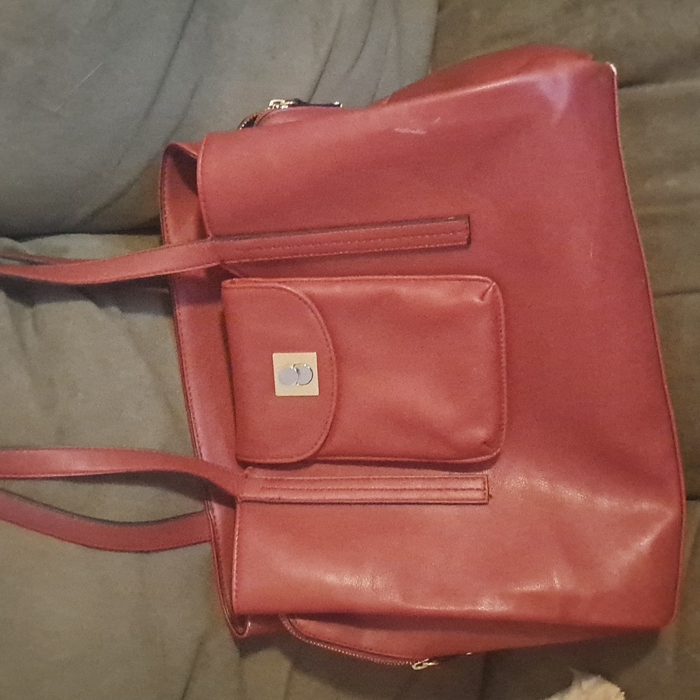 bought from Macy's used 5 times. way to big for me.has 3 big divider compartments. has removable phone attachment. brand is Alfani burgundy color