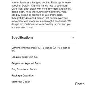 Brand new with tags, Vera Bradley Women's Outlet Reusable Tote Bag Charm! Pattern is called “Cat's Meow”, super cute and handy!! All specifications are listed in the photos.
