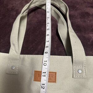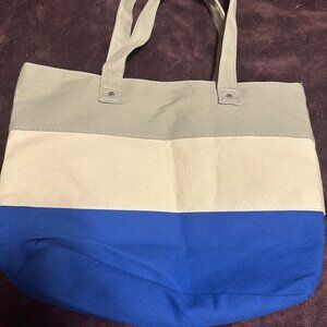 Gray, white and blue tote bag. There are three pockets on the inside.