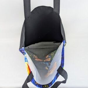 Poly poplin fabrication. Vibrant multicolor print on one side. Opposite side solid black. Open top. Unlined. No interior pockets. Double 1" wide fabric handles.