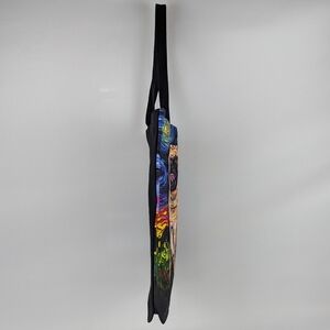Poly poplin fabrication. Vibrant multicolor print on one side. Opposite side solid black. Open top. Unlined. No interior pockets. Double 1" wide fabric handles.