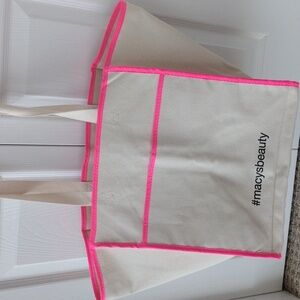 New, never used. Cute and big roomy tote bag. Cotton material. Open closure. Big pocket in the front and on the back. Cream color with hot pink trim. Has many uses - grocery store, errands, beach, lake, etc. Approximately 12x11x13.