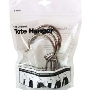New York Handbag Designer Jacki Easlick invented the new Tote Hanger®. These premium hooks are especially engineered to hang your handbags with elegance and balance. It's a small metal hook that is designed to hang on any traditional clothing rod just like coat hangers. Simply remove the contents of your handbag and hang your handbag on the hook. Made out of nickel and the size is 3-3/4"h x 2"w. 6 hooks per pack. We own the patent and trademark.