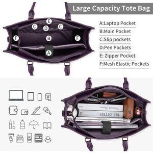 The tote bag for women is divided into 2 parts. One 15.6-inch main padded pocket is designed as a computer bag with a thick foam pad. One large open pocket is suitable for storing A4 documents, books, gadgets, iPad, etc., one zipper pocket design for personal stuff, two slip pockets and two pen pockets, and 2 mesh pockets for storing water bottles or umbrellas.